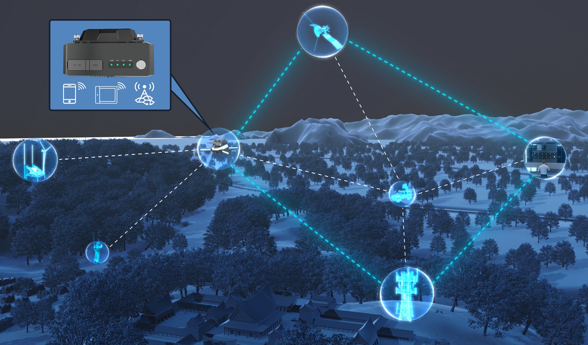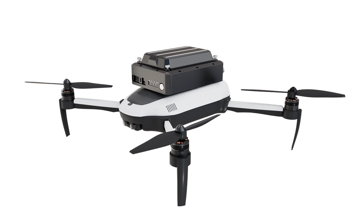 窄带自组网挂载基站着力于解决救援现场环境复杂、距离过远等通信阻碍等问题,整机采用轻量化设计,可通过部署在无人机、无人车、无人艇、救援机器人等类型设备,解决因复杂环境下导致人员无法到达的通信补盲难题。