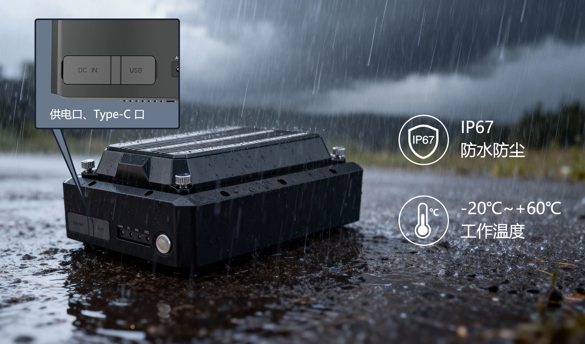 可选配 4G 公网模块,插入流量卡即可在公网覆盖区域实现公网链路联网通讯;具备供电、Type-C 等接口,采用 IP67 防水防尘设计,环境适应能力强,同时支持无线写频,功能扩展与维护便捷。